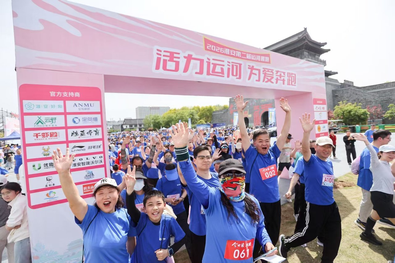 4月18日,江苏淮安第二届“活力运河·为爱奔跑”趣跑活动在清江浦广场漕运门举行,吸引了1600余名职工群众参与。