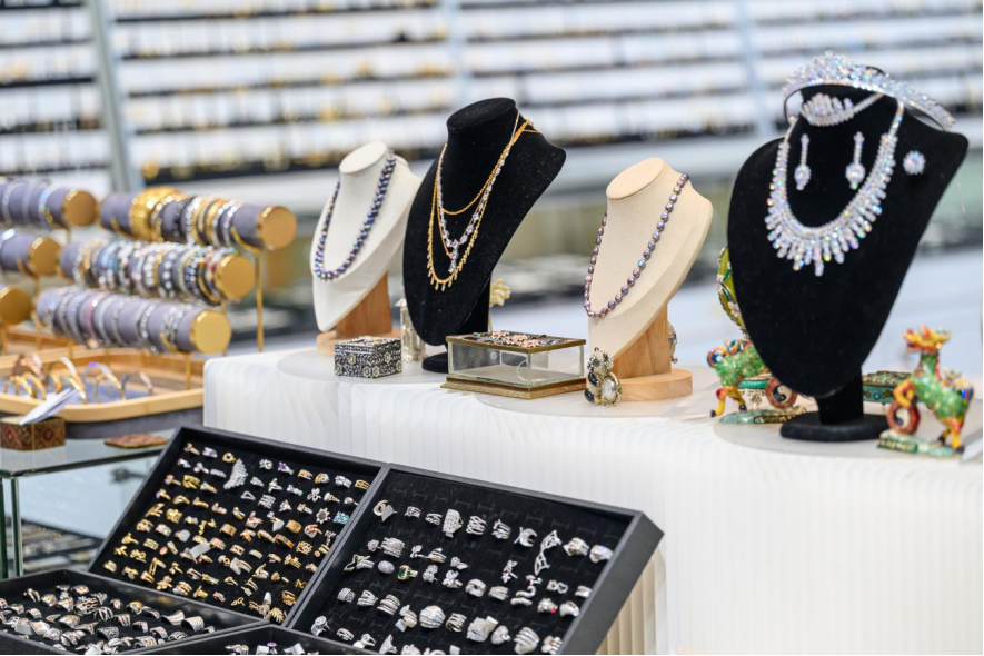 东莞市金桨饰品有限公司的展位则是另一种风格——灯光下的铜、银、不锈钢饰品闪耀夺目,企业总经理牟小燕笑称,“人流量肯定是第一的”,不少客商一边拍照,一边询问材质与定制方案。
