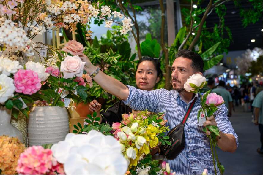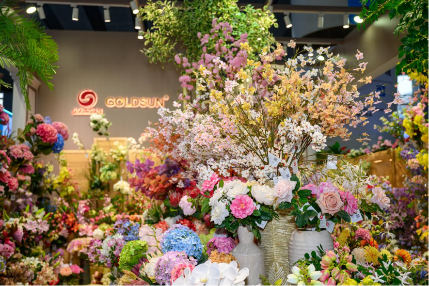东莞市竟成工艺制品有限公司的展位,被不少客商称为“现场最美的展位”。成排的仿真花在灯光下呈现出接近真实植物的色泽与层次,触感细腻,几乎看不出“仿真”的痕迹。德国、意大利、英国的采购商在展位前驻足挑选,有的当场下单,有的则现场确认返单计划。